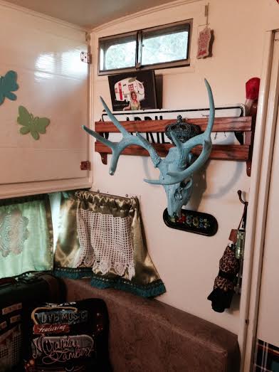 This is the right wall just inside the door. The previous owner had left behind some hints of turquoise and lime green, so I decided to go with it. The deer skull was a fun find at a local gun show that was originally pink but it needed turquoise paint and glitter to fit in.