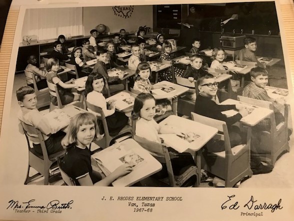I was in Mrs. Butts’s third grade class at J.E. Rhodes Elementary in Van, Texas. Mrs. Butts was a tall and beautiful lady who always had a smile ready. The main thing I remember about her class is the make-believe post office she had at the back of her classroom. Or was that in Mrs. Russell’s second grade classroom?