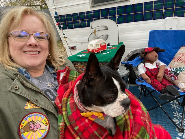 Stella and me trying to stay warm at the campsite. She has become quite the little traveler!