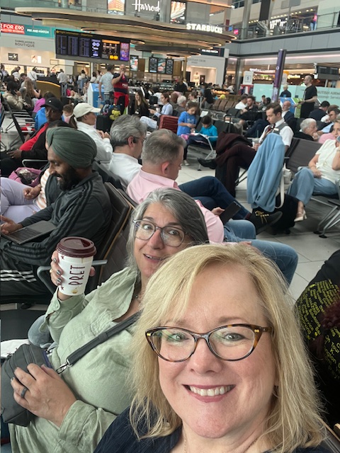 When we finally landed at London’s Heathrow Airport, our mission was to find the restroom and then find our gate, a herculean task, apparently. Because we were six hours early, it wasn’t posted on the flight screens yet. When it was finally posted, we had to hop on an airport bus to be transported to Terminal 5, seemingly halfway around the facility.