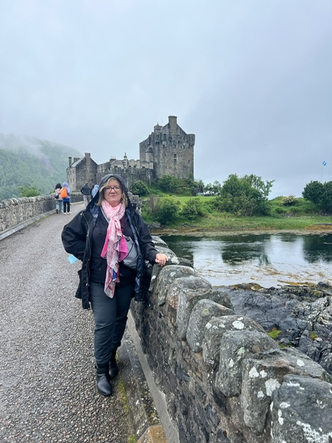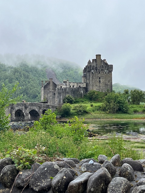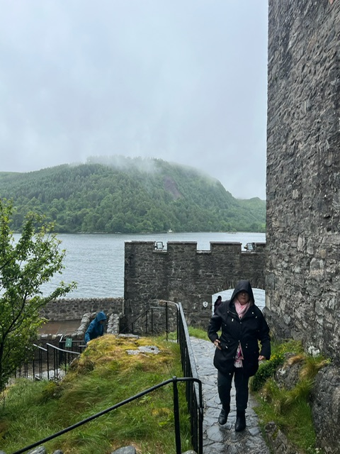 Our next stop was Eilean Donan Castle, where we were given time to tour the castle and explore the gift shop and cafe. It was drizzly and cool, my favorite kind of weather! As you may know, I can’t go anywhere without taking some type of fall, and this time it was in the castle. Trisha and I were in a bedroom and there was a window with a sitting area overlooking the lake. I wanted to see the view, but I didn’t notice there was a step up. I blame that on my progressive lenses. Bang, my right knee hit the ancient stone. Trisha helped me up and we were able to continue, with some pain, but–I was in Scotland! I had to keep going! And I didn’t even tear my new joggers.