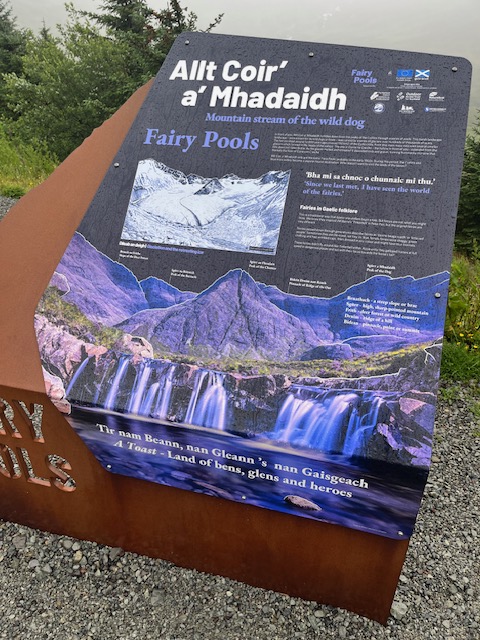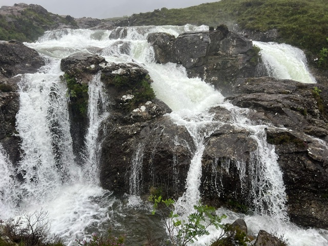 Our last stop was the famous Fairy Pools on the Isle of Skye. When we arrived it was raining hard and windy, and our guide told us the walk was steep down and back, and if we didn’t want to or were unable to do the walk, there was a small building with chairs where we could wait. I told Trisha I had better not do the trail since I had already taken a fall. But she is braver than I (or maybe not, since I was driving a car!) and she headed down, confident her waterproof joggers, hiking shoes, and raincoat would keep her dry.