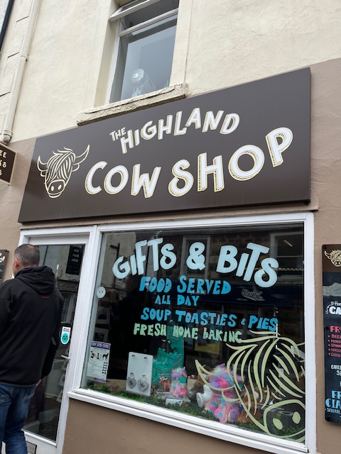 We stopped for lunch in Portree, a beautiful little town on the coast. We were on our own for an hour so Trisha and I looked for restaurants. The first one we tried had a line out the door that wasn’t moving, and the people ahead of us–not Americans!–were badmouthing our President, so we left. The second one we entered and no one greeted us, although a server saw us. We finally stopped in at the Highland Cow Shop, a combo souvenir shop and cafe where we managed to find a seat at the window and dined on hot cappucinos and grilled ham and cheese toasties (sandwiches).