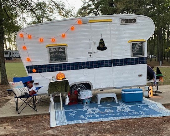 One of my favorite things to do is camp or “glamp” (glamour camping) in my vintage camper. Miss Millie is my happy place where I can go to be alone, write, or watch DVDs. I belong to a ladies’ camping group and we have a wonderful time whenever we’re together.